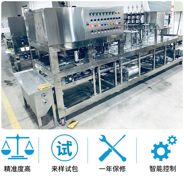 2.傳動與模板牽引系統:包括電機減速機、精密平穩分度傳動裝置組成的直線間隙傳動系統,以及不銹鋼牽引傳動鏈條、定位裝置、鋁模板等,采用無級調速器可實現對醬料自動灌裝封杯機運行速度的調整