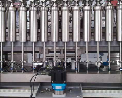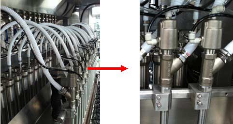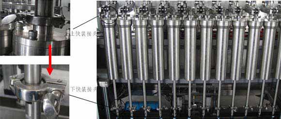 4、氣缸帶動灌裝頭運行的下潛灌裝方式,配合可設定的變速灌裝功能,可降低易起泡物料在灌裝時泡沫的產生,防止物料外溢造成的瓶口污染。同時將灌裝頭下潛的氣缸動作機構移到積液水盤的下方,防止外濺物料對氣缸等零件的腐蝕,目前只有我公司采用這種專利機構。