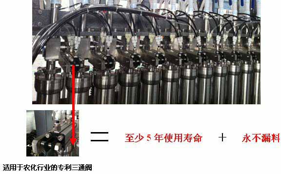 3、根據高粘度灌裝機5年的研發經驗及市場反饋,我公司自行成功研發出更適合農化行業的灌裝三通閥。該三通閥結構簡單、性能可靠,最大的優點在于使用壽命長,密封可靠,長時間使用后不漏料。目前該三通閥技術是我公司的獨家專利。