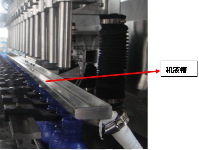 6、在灌裝頭下方安裝有獨立氣缸控制的殘留滴液收集槽,確保灌裝頭關閉后藥液不滴漏到瓶口外。